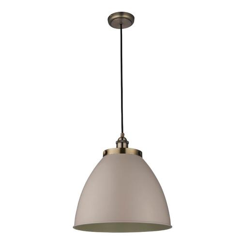 Pendant ceiling light finished in antique brass with a vintage stone colour paint shade suspended on black fabric flex for a trendy bistro look