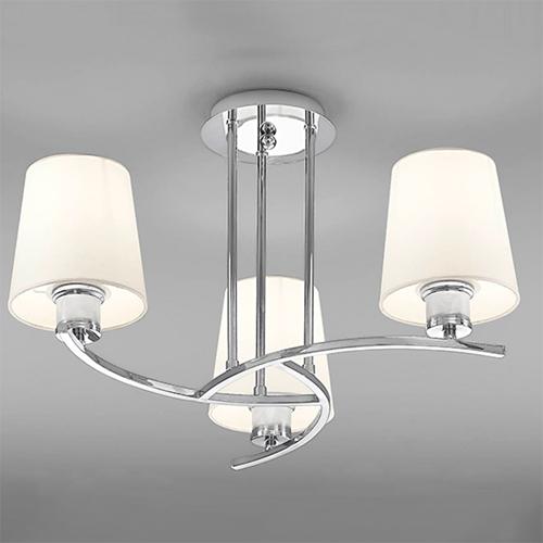 3 light ceiling light finished in polished chrome with square profile arms complete with cream fabric shades