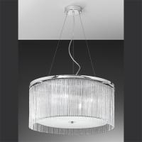 4 Light chrome finish oval ceiling light fitting with a lurex fabric shade surrounded by suspended delicate glass rods and a glass cover at the base of the shade to conceal the lamps