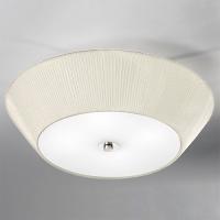 Flush ceiling light with a pleated cream fabric shade and a satin glass bass which conceals the lamps