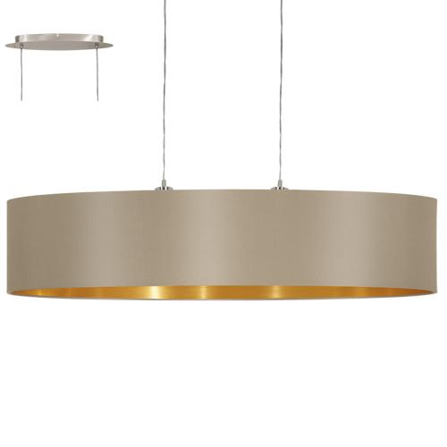 2 light pendant ceiling light finished in satin nickel with taupe fabric shade with inner gold lining ideal for contemporary lighting design ideas