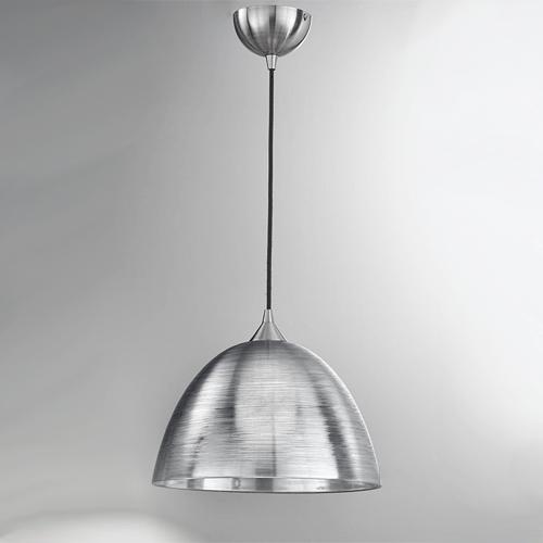 Medium pendant light with satin nickel finish metalwork complete with translucent silvered glass with circular textured effect on the outside suspended on a braided black cord