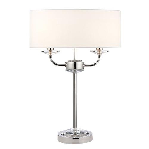 2 Light table lamp finished in bright nickel plate complimented with delightful crystal candle pans complete with an oval vintage white faux silk shade