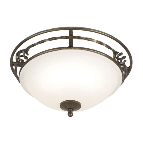 Flush ceiling light finished in black gold made from hand-forged iron with attractive scroll twist detailing complete with opal glass shade