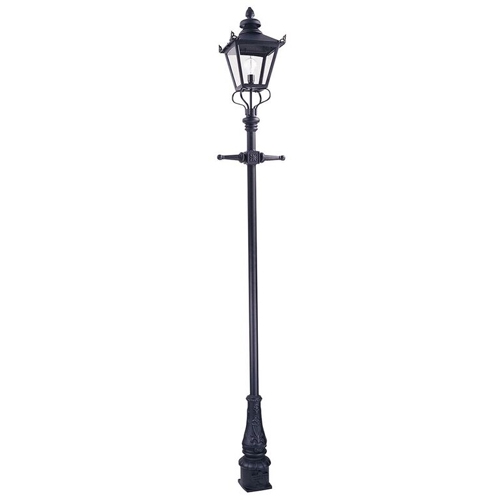 Elegant Victorian style outdoor lamp post made predominantly of cast aluminium finished in black with clear glass panels and 'T' bars and beautiful detail to the base with access door to assist wiring installation