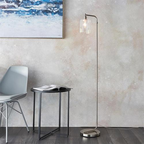 Floor lamp finished in brushed nickel plate in a contemporary design complete with clear glass shade ideal to use with filament LED lamps