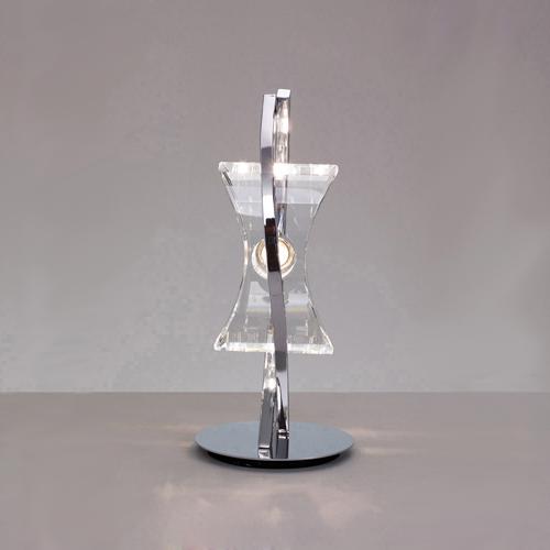 Table lamp finished in polished chrome dressed with substantial multifaceted optical glass which has been carved into a curved shape which reflect light in a beautiful prism of colours