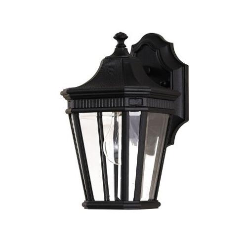 Outdoor period small wall lantern in a black finish manufactured in die cast aluminium featuring architectural moulding at the top of each pane of clear bevelled glass ideal for all outdoor period lighting requirements
