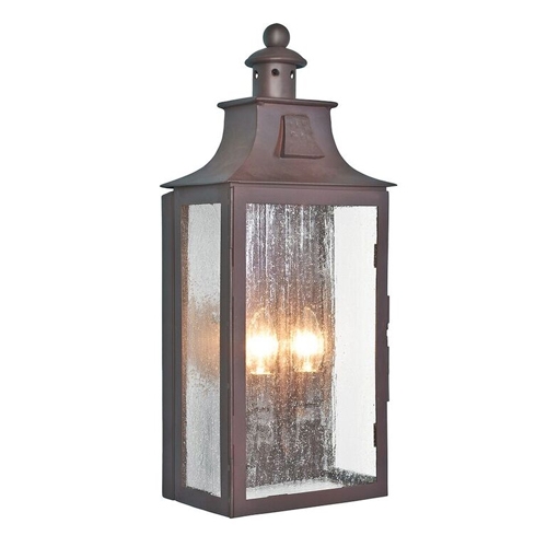 Outdoor hand-made medieval style half wall lantern in an old bronze finish complete with textured glass panels